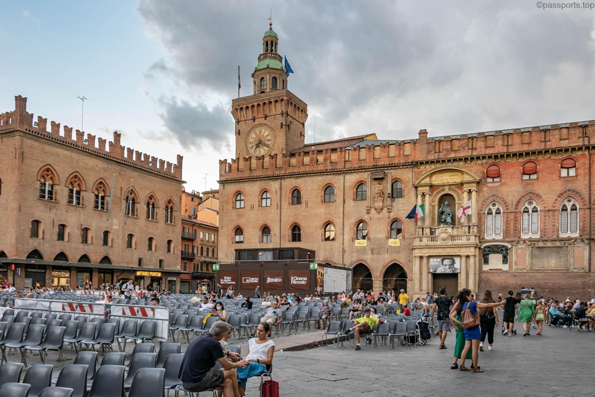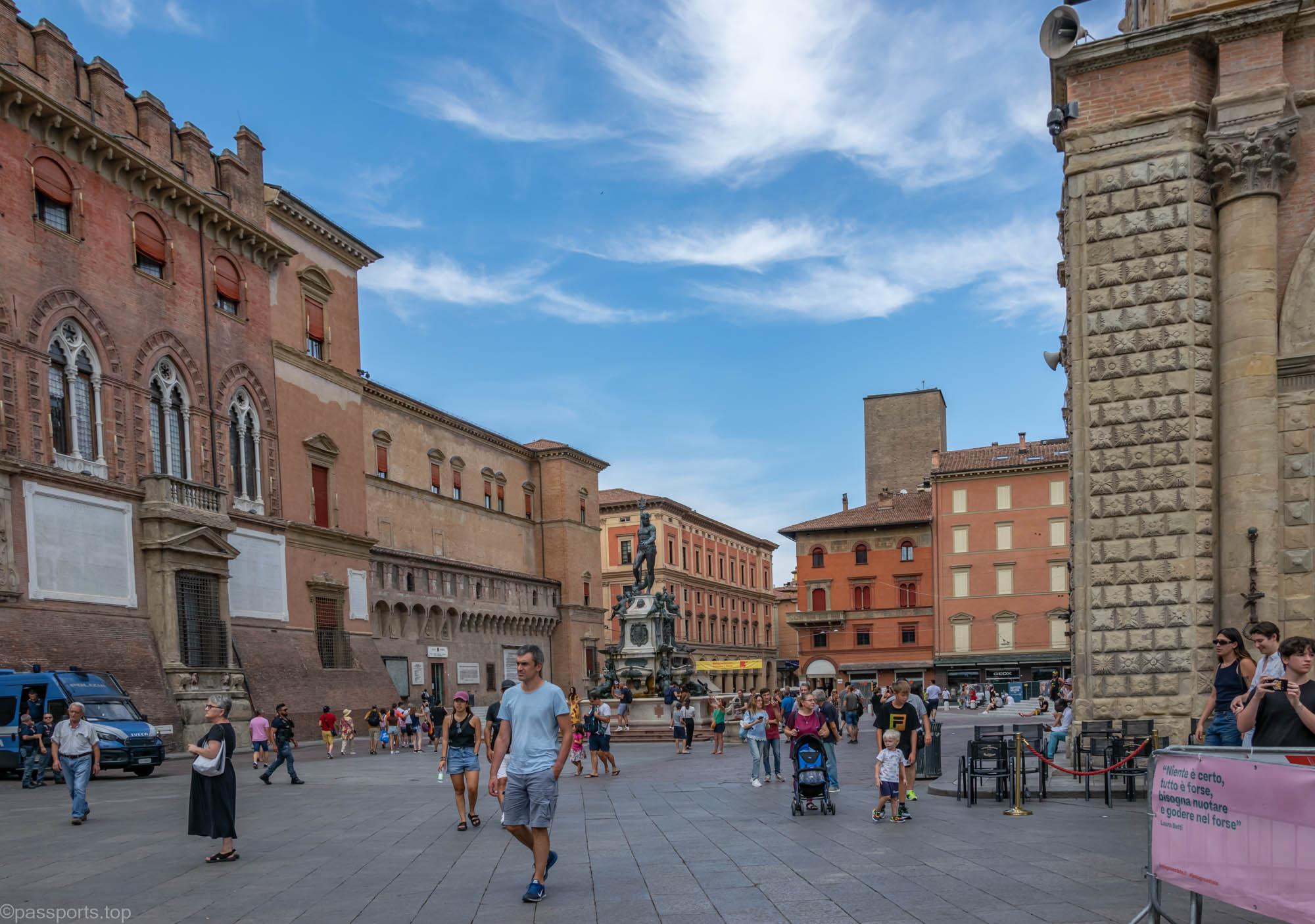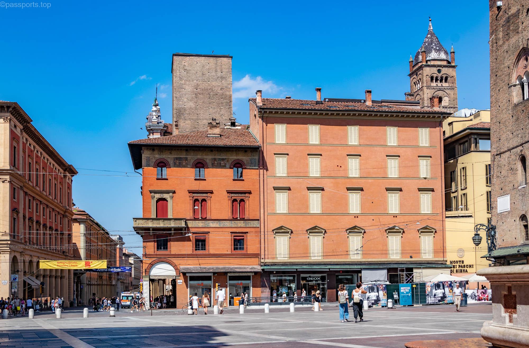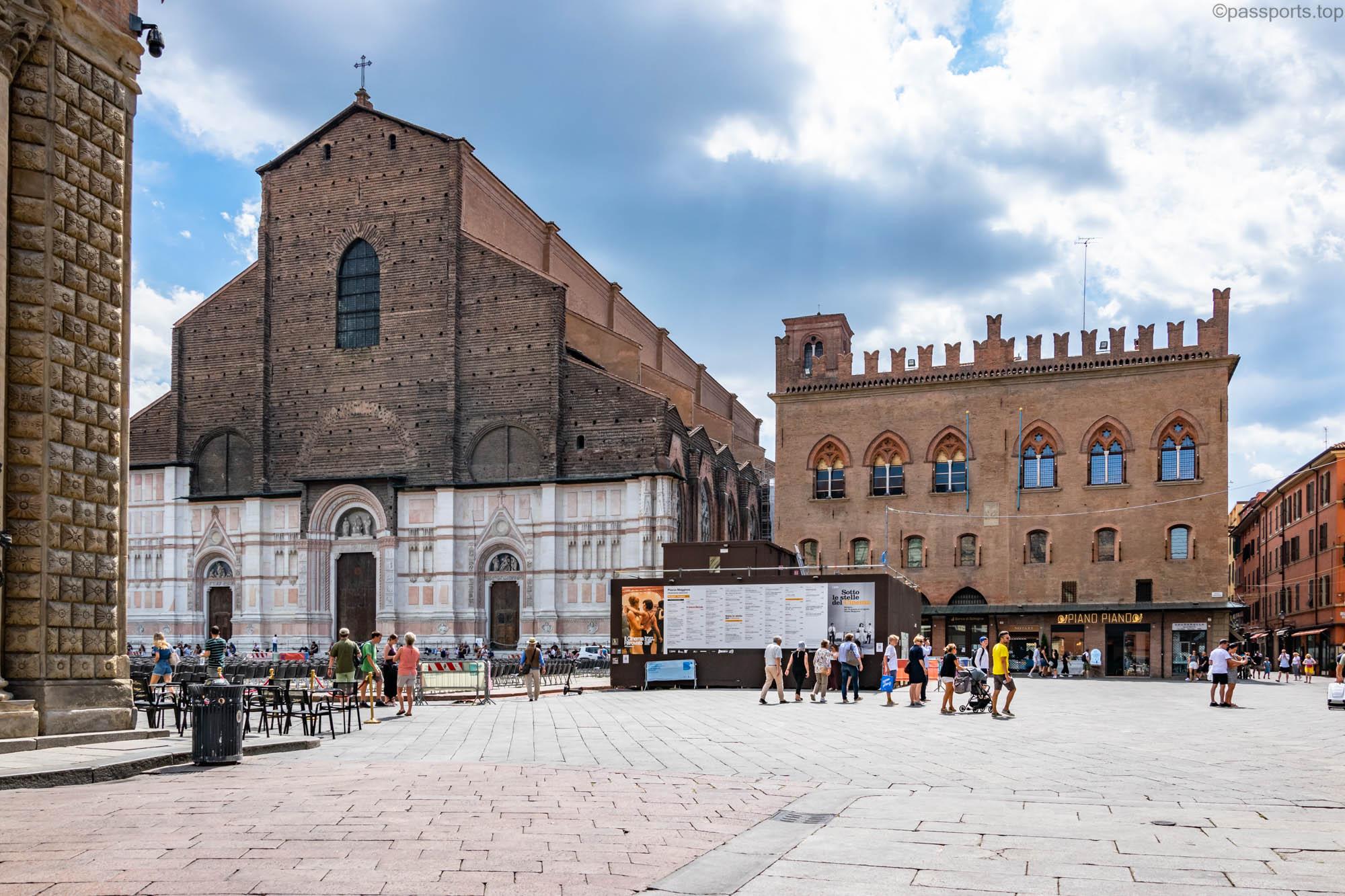 Piazza Maggiore este mărginită de clădiri medievale vechi, inclusiv catedrala principală (Basilica di San Petronio), Palazzo d’Accursio, Palazzo dei Notai, Palazzo del Podestà și Palazzo dei Banchi.