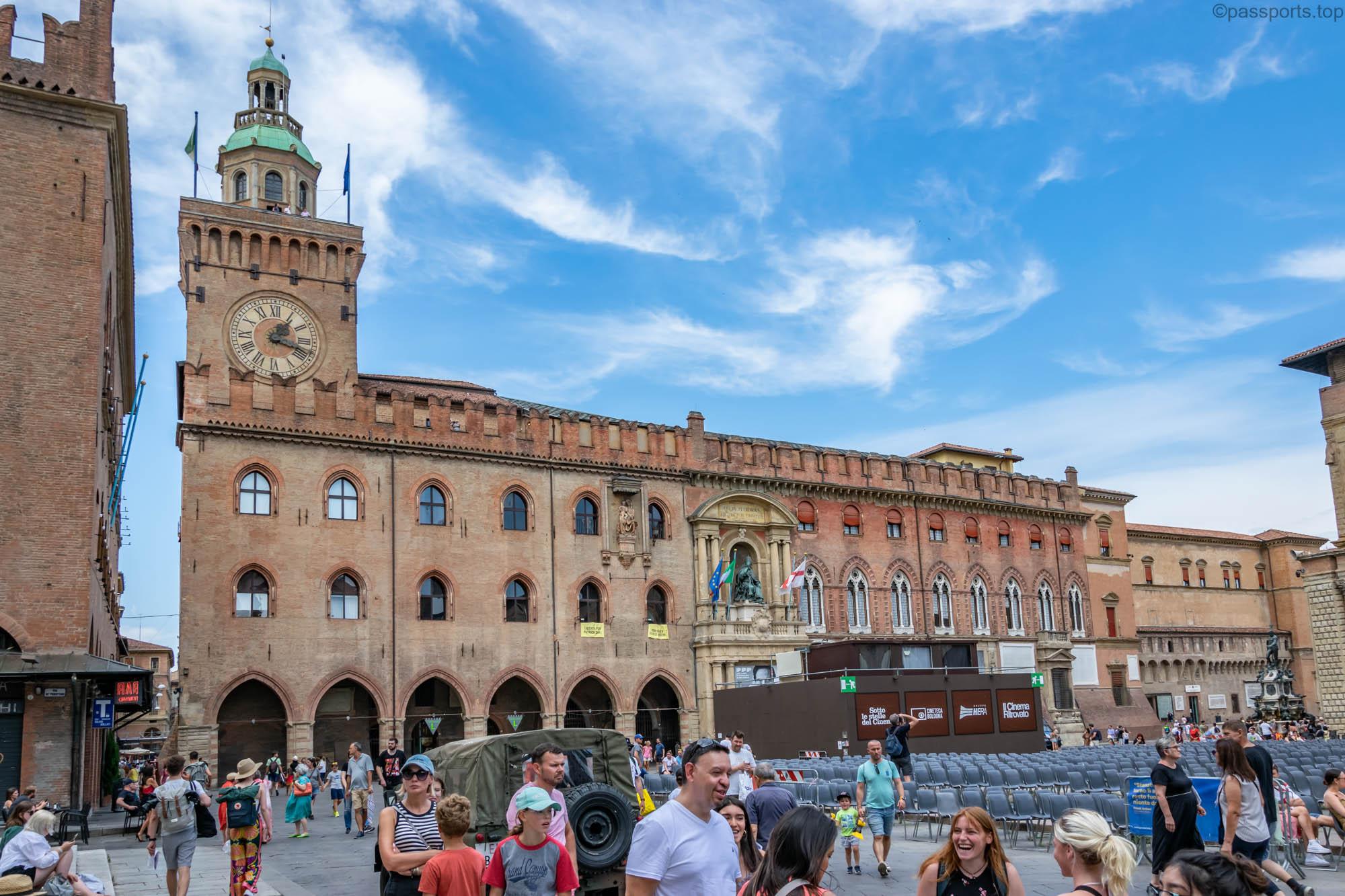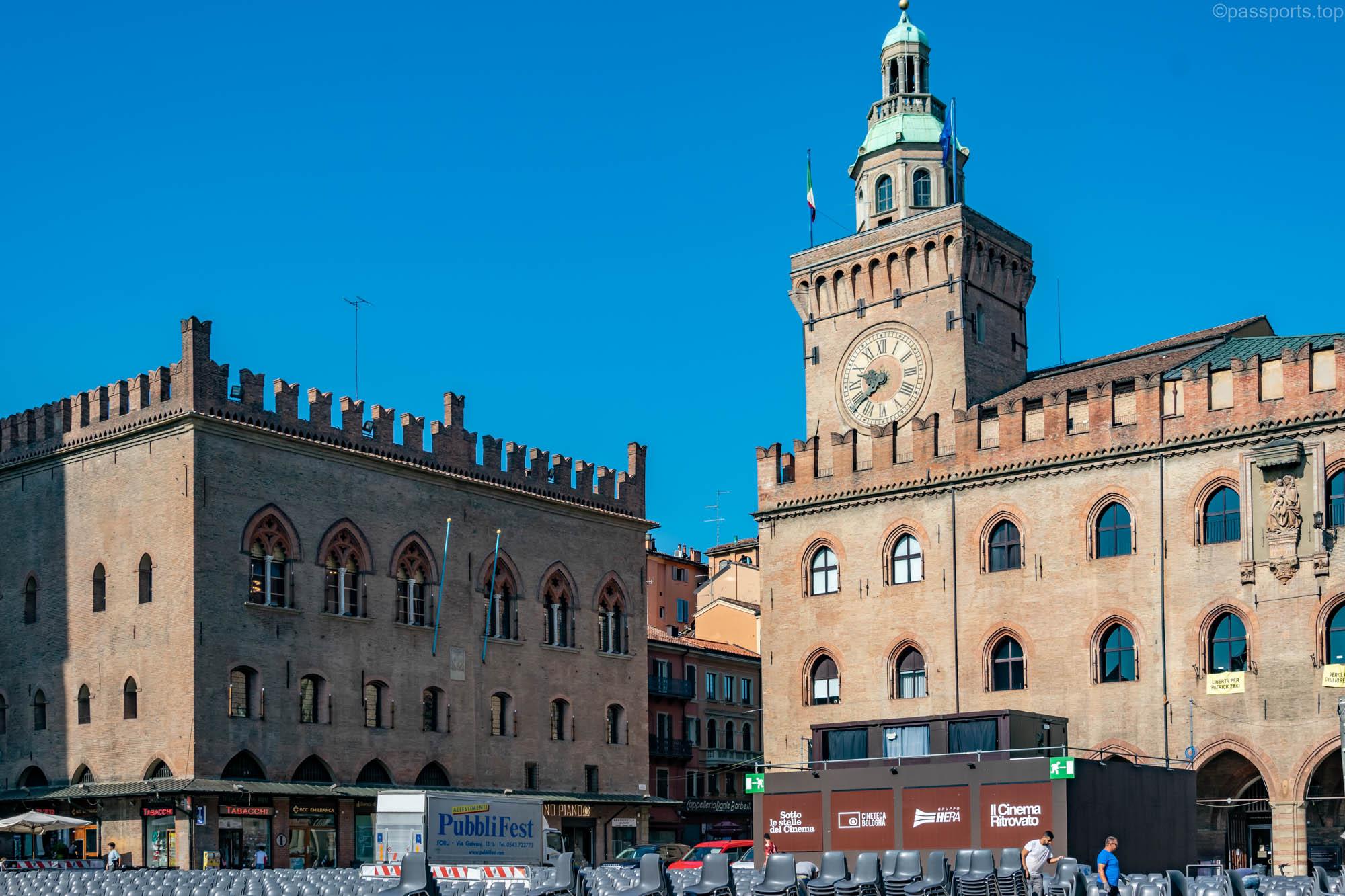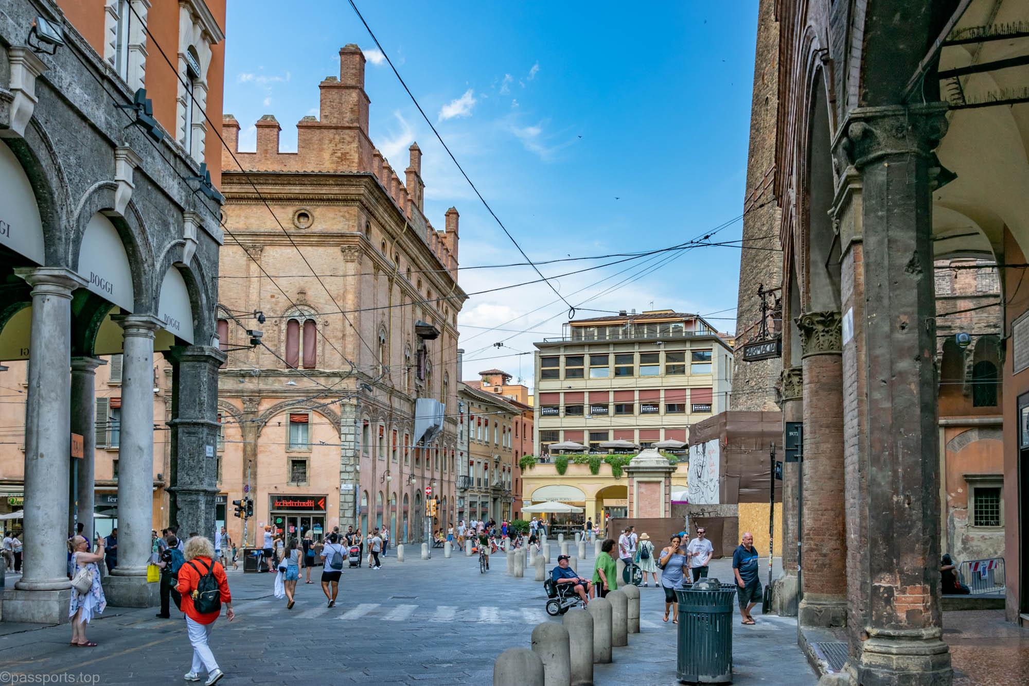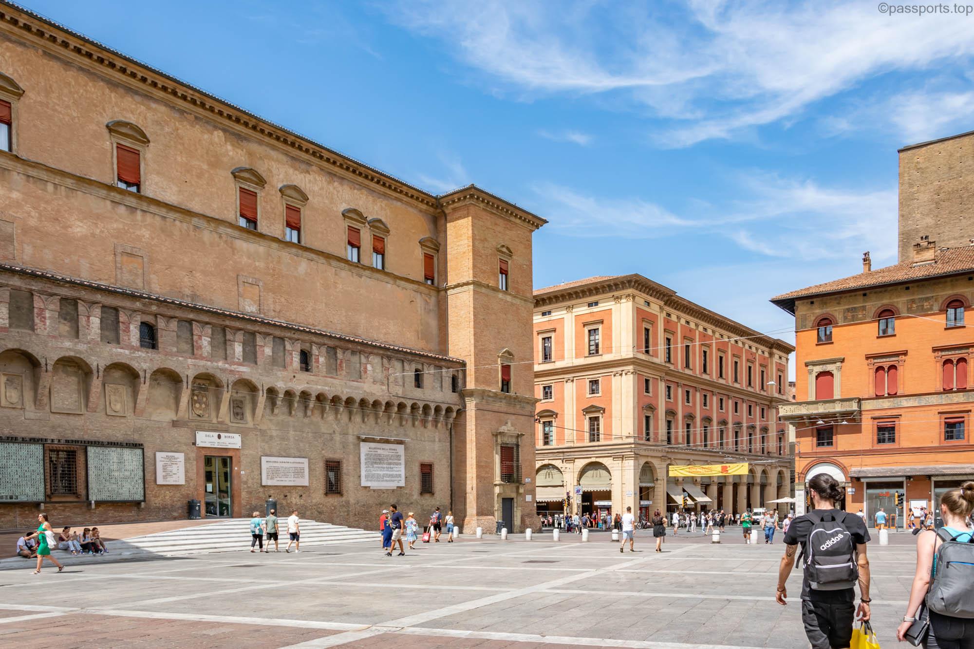 Piazza Maggiore este mărginită de clădiri medievale vechi, inclusiv catedrala principală (Basilica di San Petronio), Palazzo d’Accursio, Palazzo dei Notai, Palazzo del Podestà și Palazzo dei Banchi.