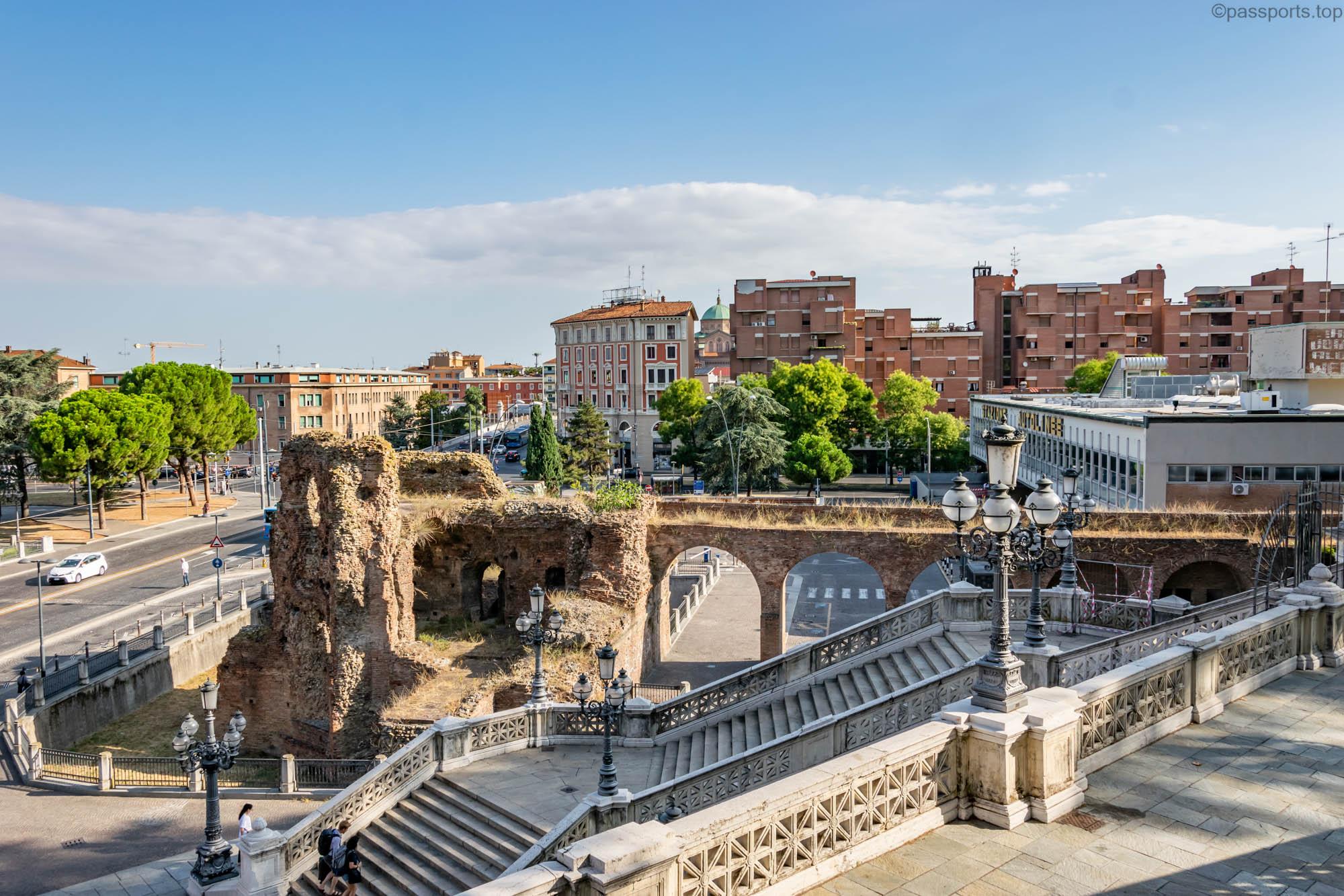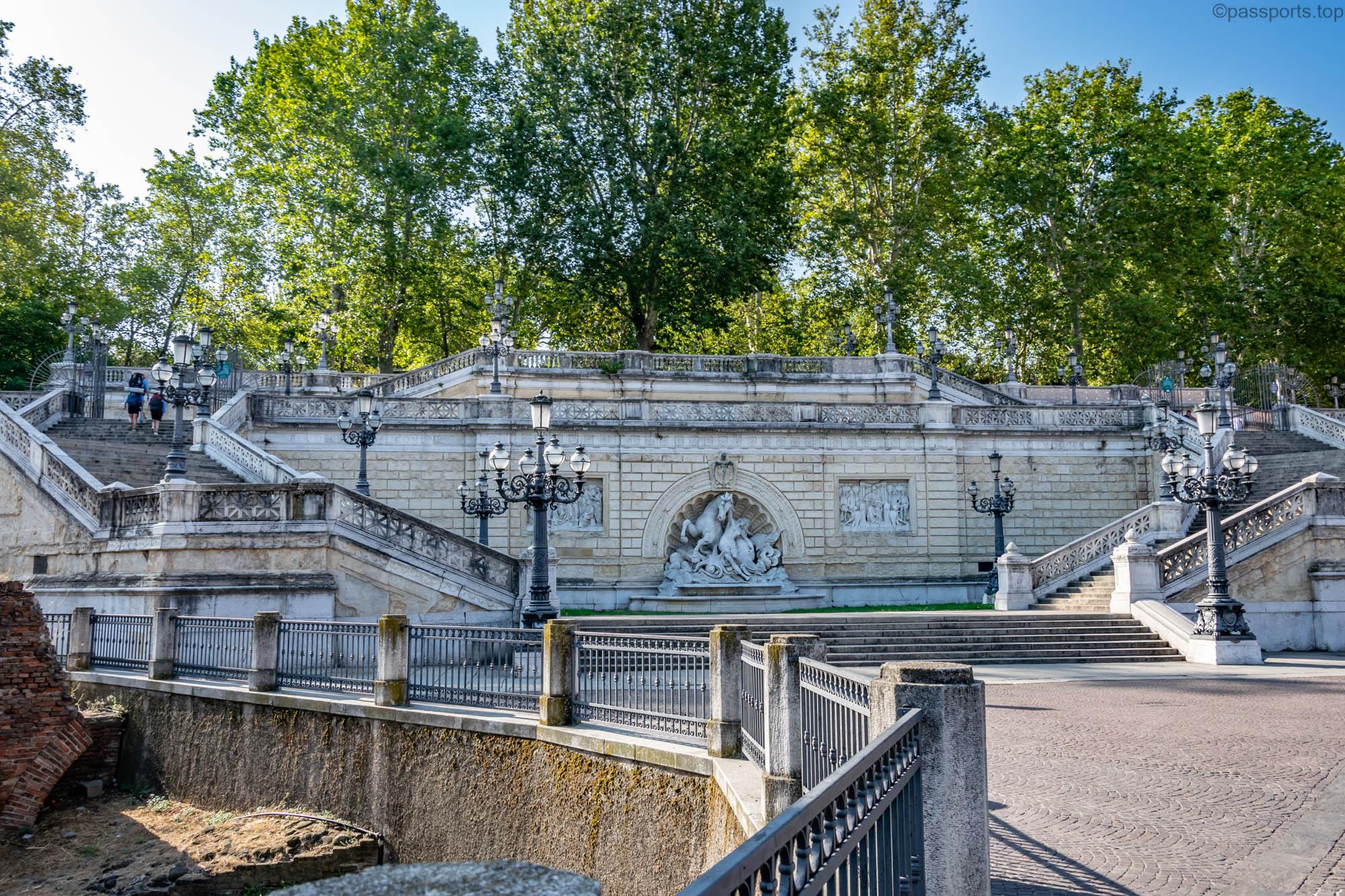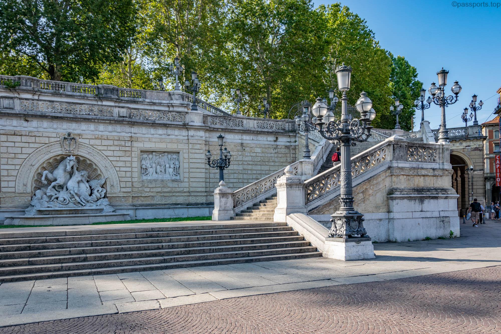 La intrarea dinspre Via dell’Indipendenza se află scările monumentale care au fost construite în 1896, fiind decorate cu sculpturi inspirate din istoria orașului.