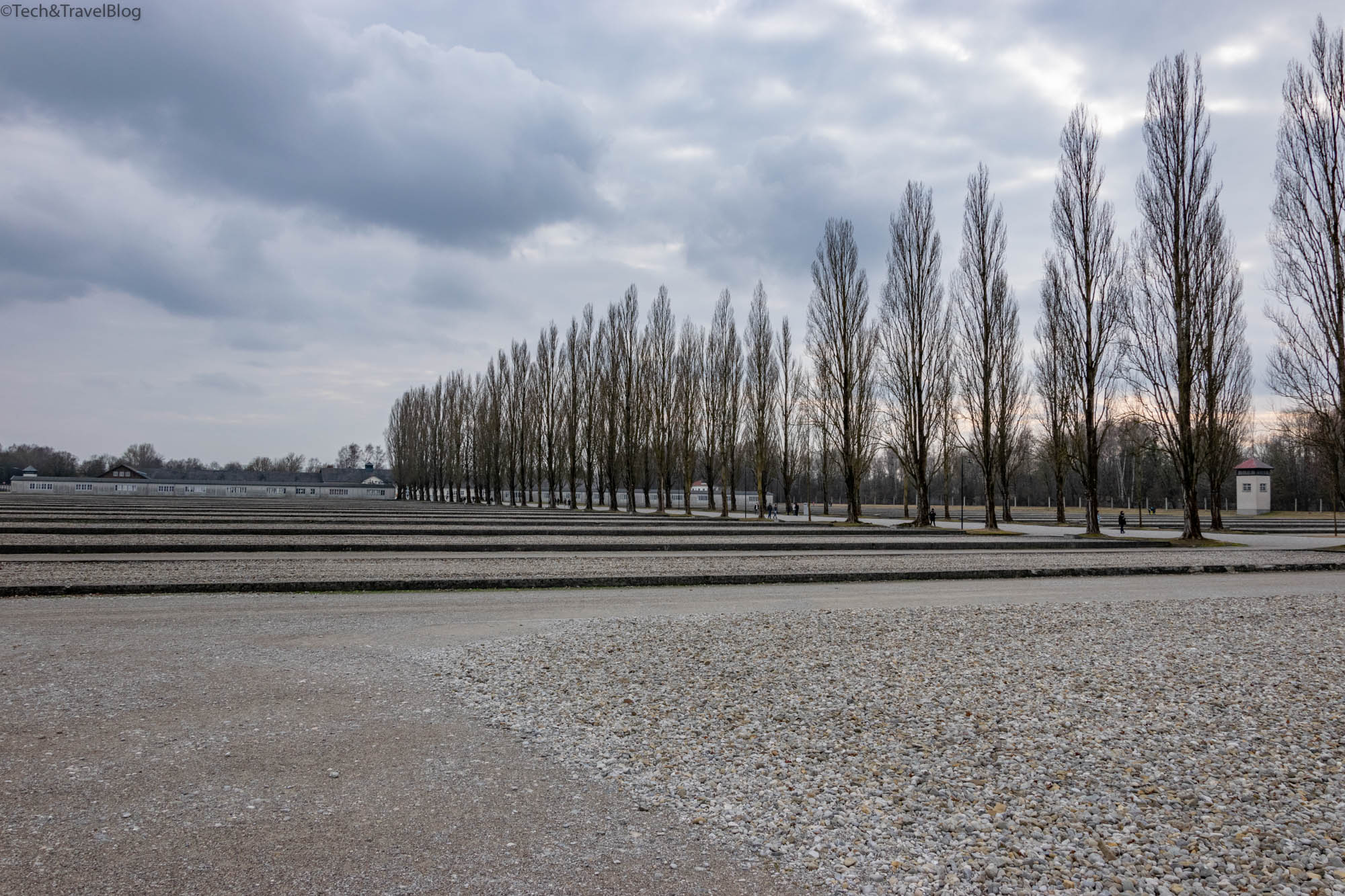 În spatele lor este un drum lung ce duce spre crematoriu, pe de-o parte și de alta aflându-se doar fundațiile numerotate ale fostelor barăci.
