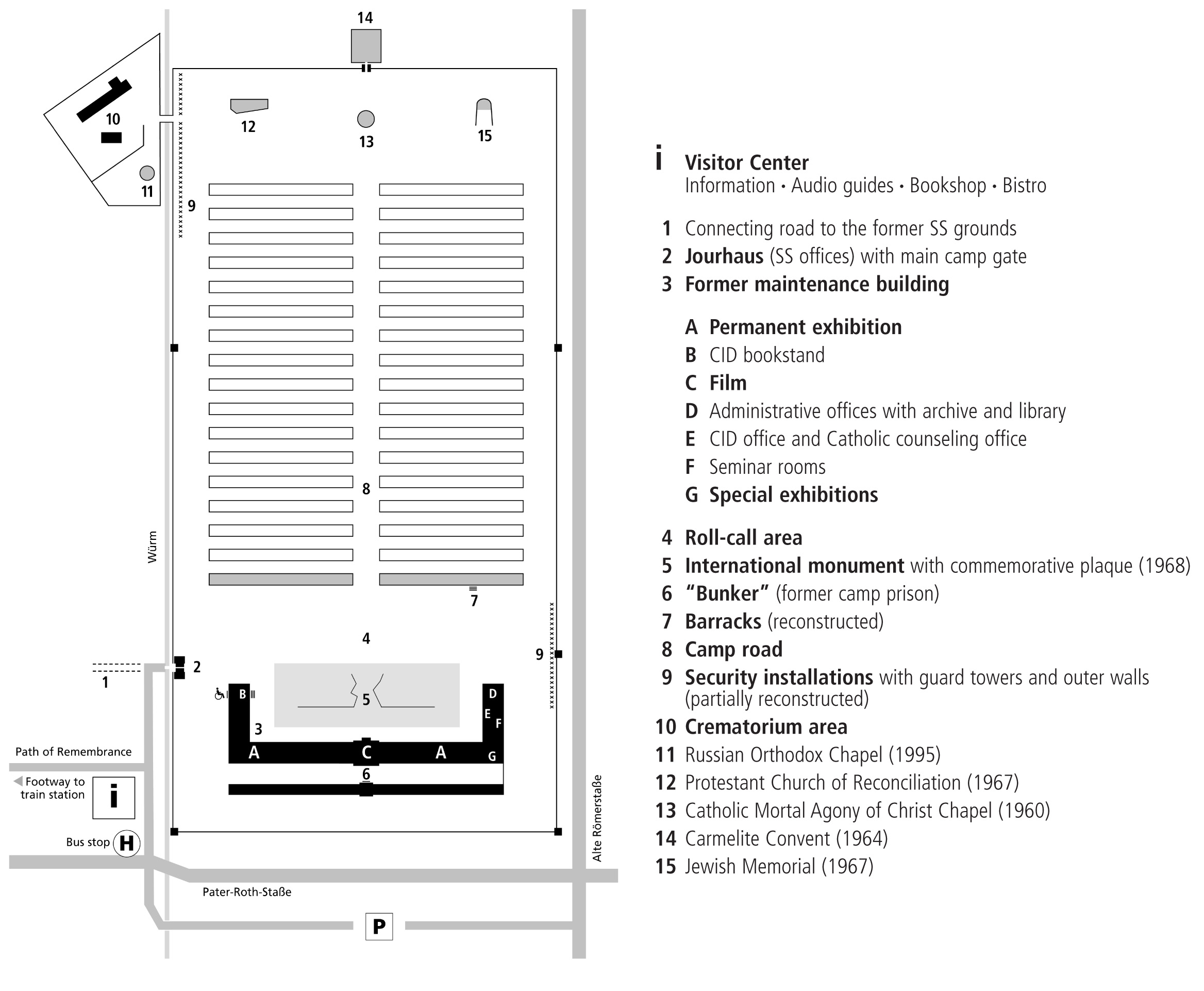 În interiorul lagărului au fost păstrate clădirile administrative, camerele de dezinfecție, închisoarea și crematoriul și se mai găsesc două capele (Capela Catolică și Capela Ruso-Ortodoxă), Memorialul Evreiesc, o Biserică Protestantă și două barăci reconstruite.