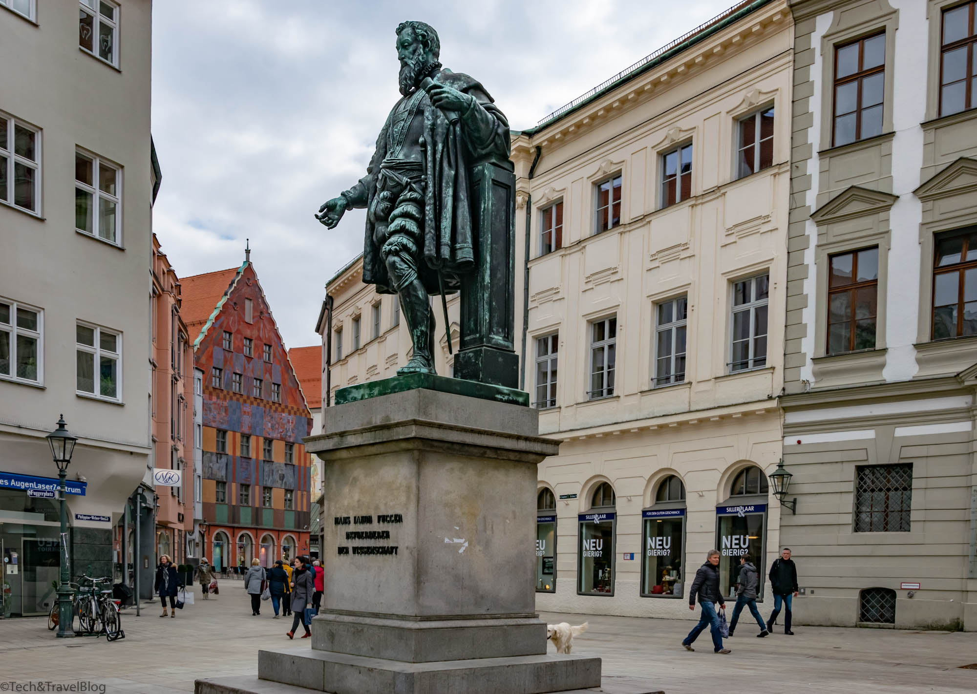 Fuggerhäuser. Between 1512 and 1515 Jakob Fugger the Younger designed and built two linked houses on Via Claudia (today Maximilianstraße), modeled on the buildings he encountered on his travels in Italy. The original building was the first Renaissance style construction north of the Alps. In 1517 he bought other neighboring houses and integrated them into the complex. The exterior facade is one of the longest on Maximilianstraße and shows the wealth of the Fugger family. Inside the complex were created four courtyards with arcades, columns clad in Tuscan marble and pools of water.