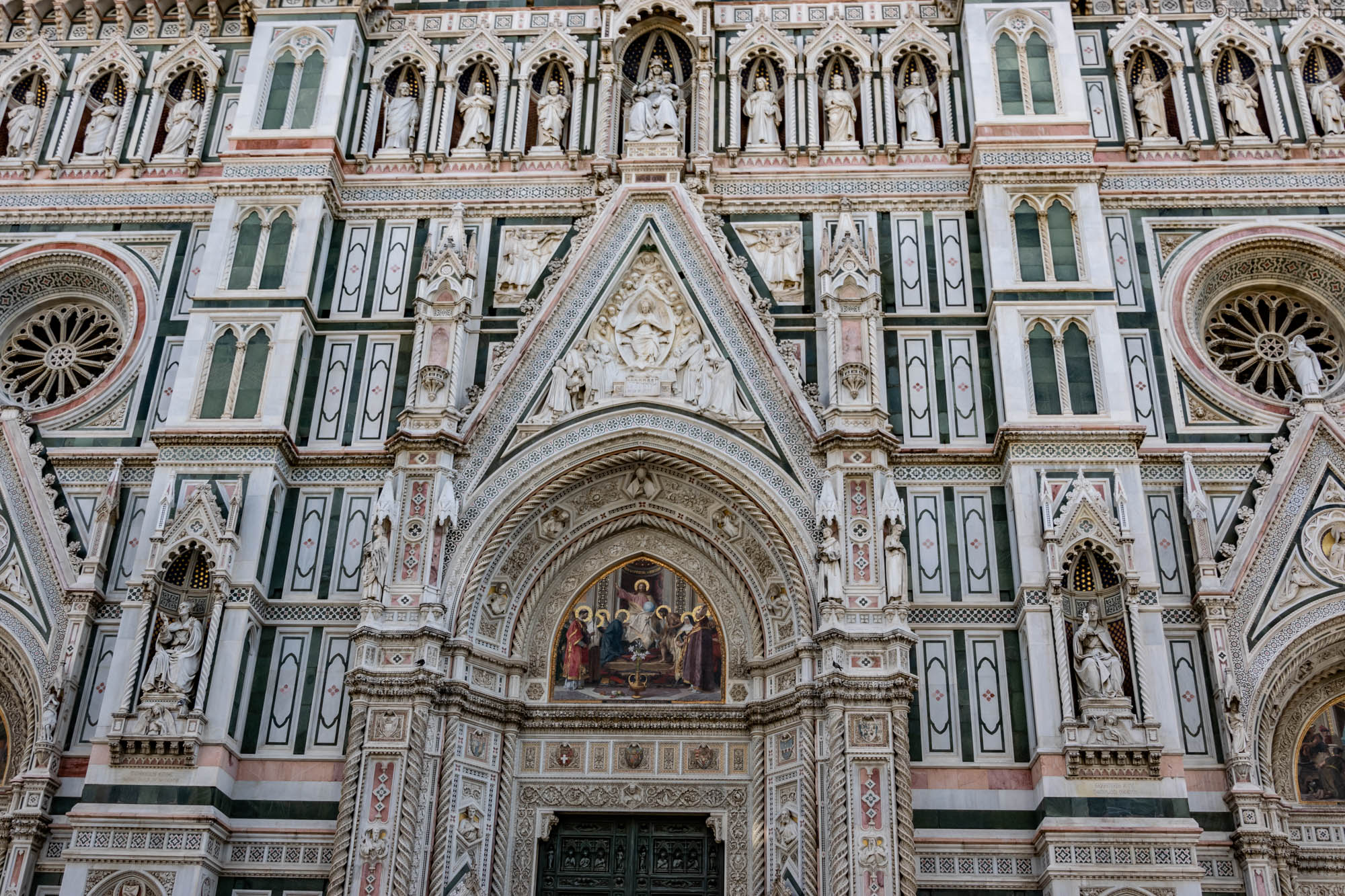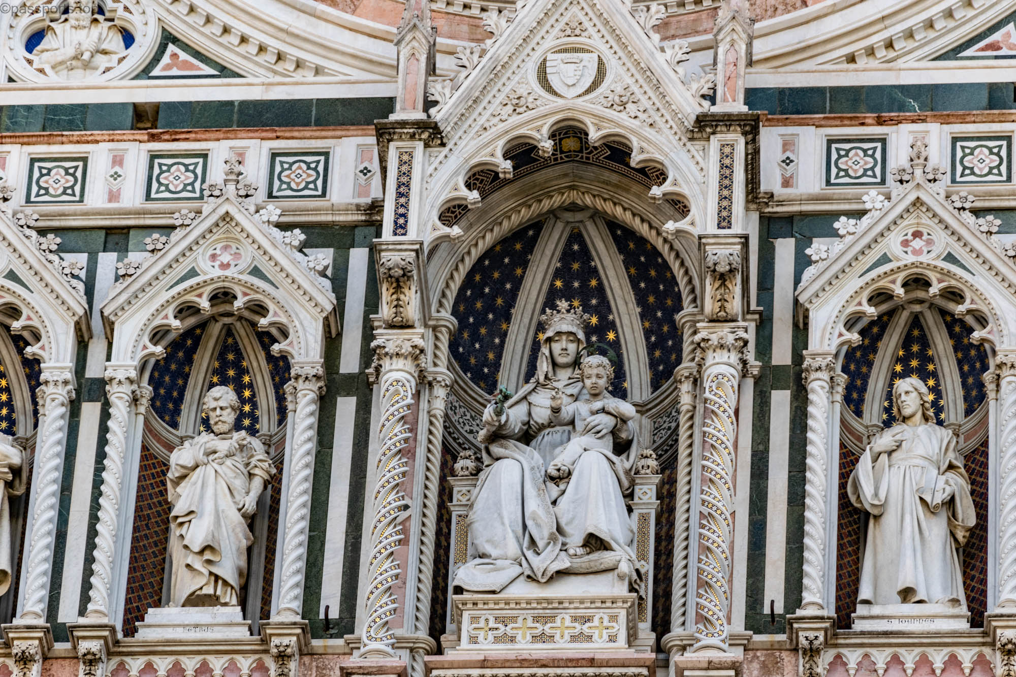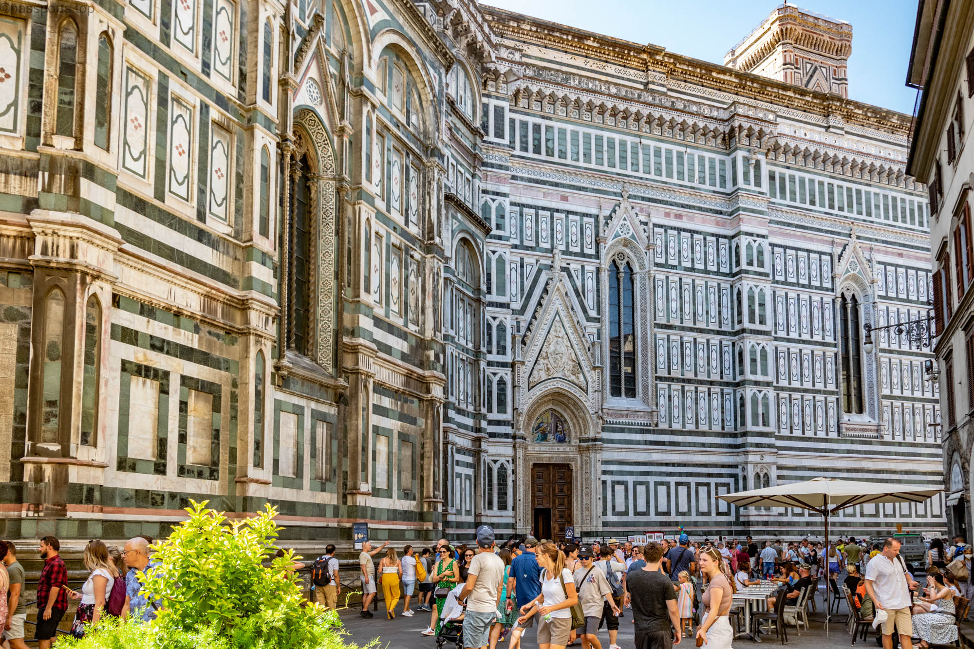 Giotto’s bell tower is one of the four main monuments in Piazza del Duomo and is separate from the cathedral building. From above you can admire the splendid dome of the cathedral. The tower is the most eloquent example of 14th-century Gothic architecture in Florence. It is clad in white, red and green marble, like the dome, and is considered to be the most beautiful tower in Italy.