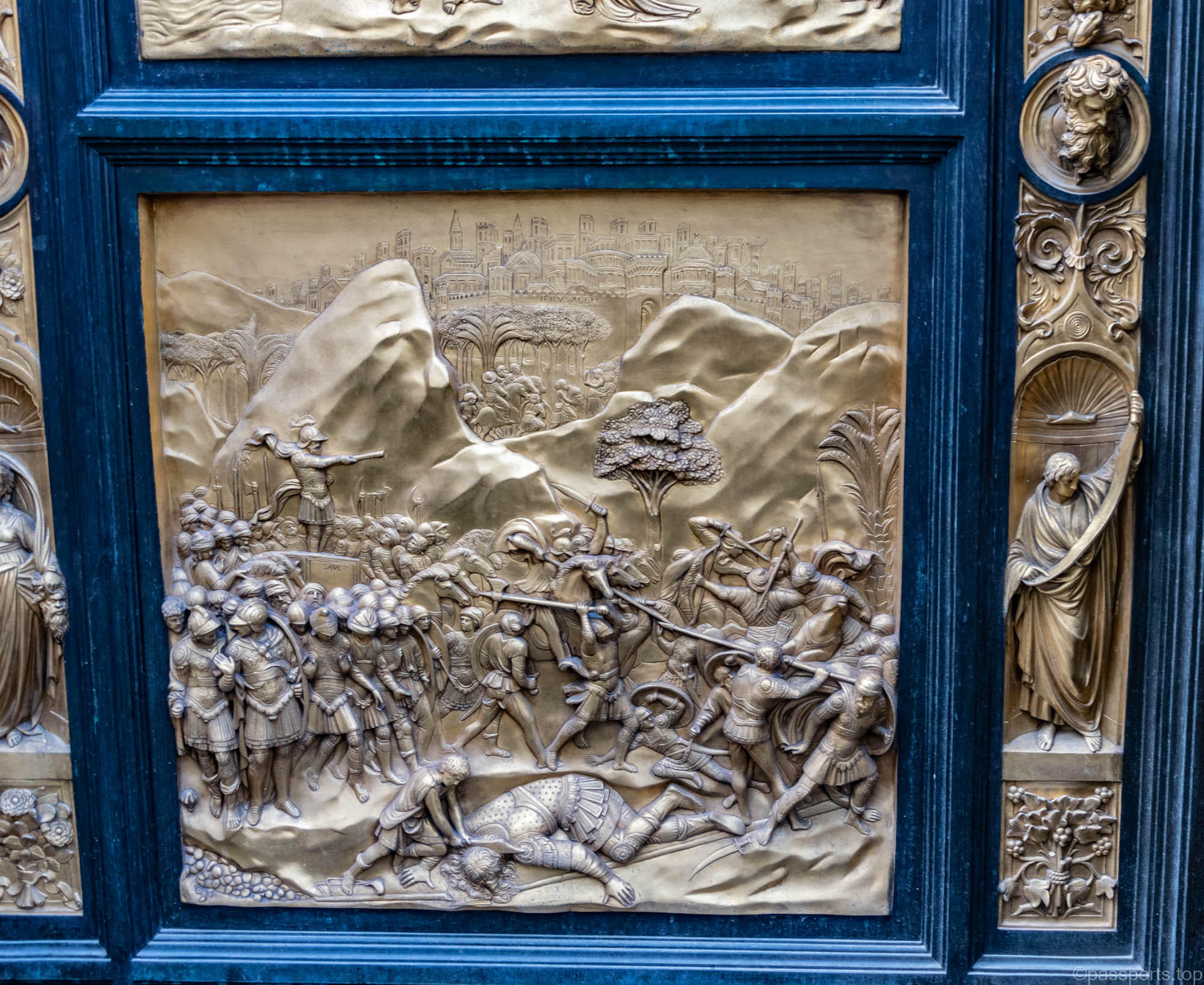 The baptistery is one of the oldest buildings in the city, built between 1059 and 1128 in the Florentine Romanesque style, and is famous for its bronze doors with relief carvings.