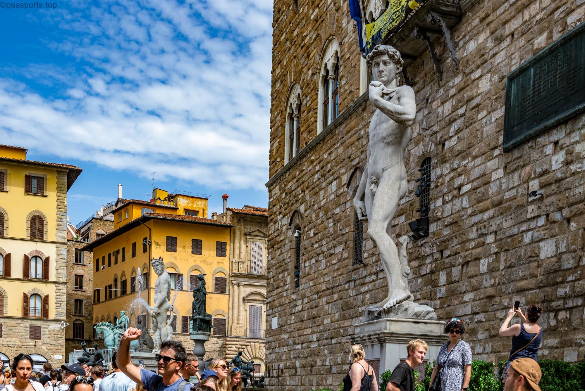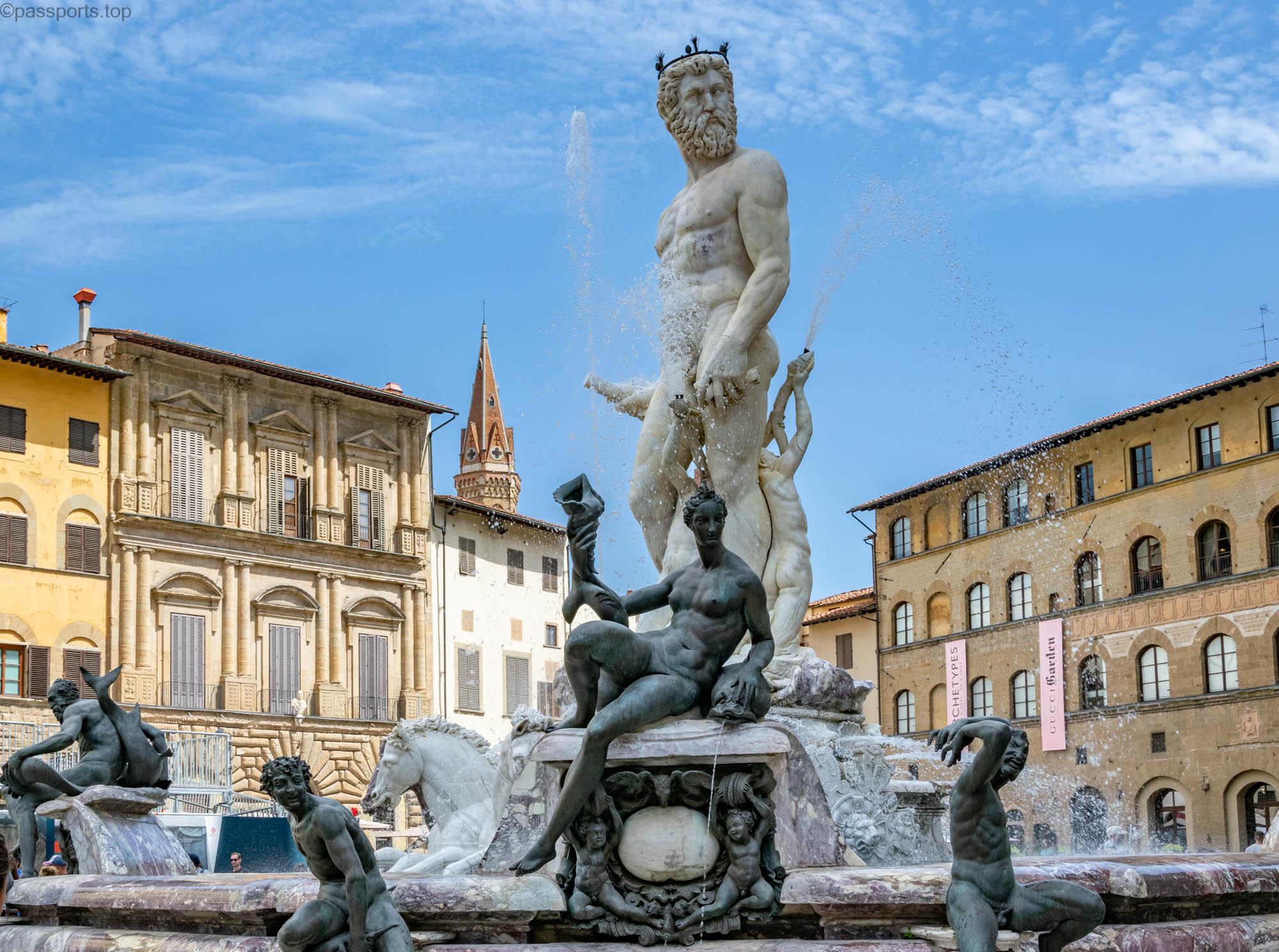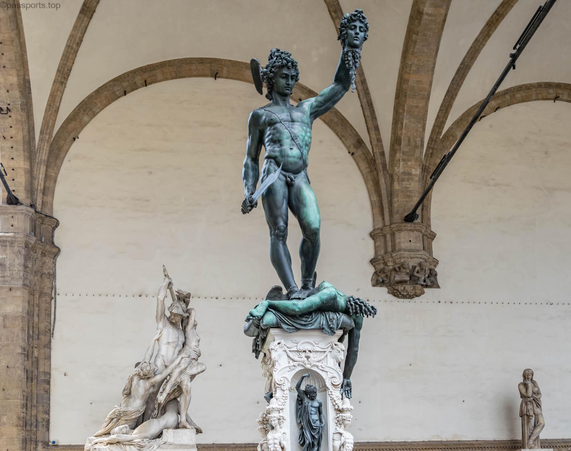 The square is full of statues, and among the most important are the 500-year-old Fountain of Neptune, Perseus with the head of Medusa and the replica of the statue of David.