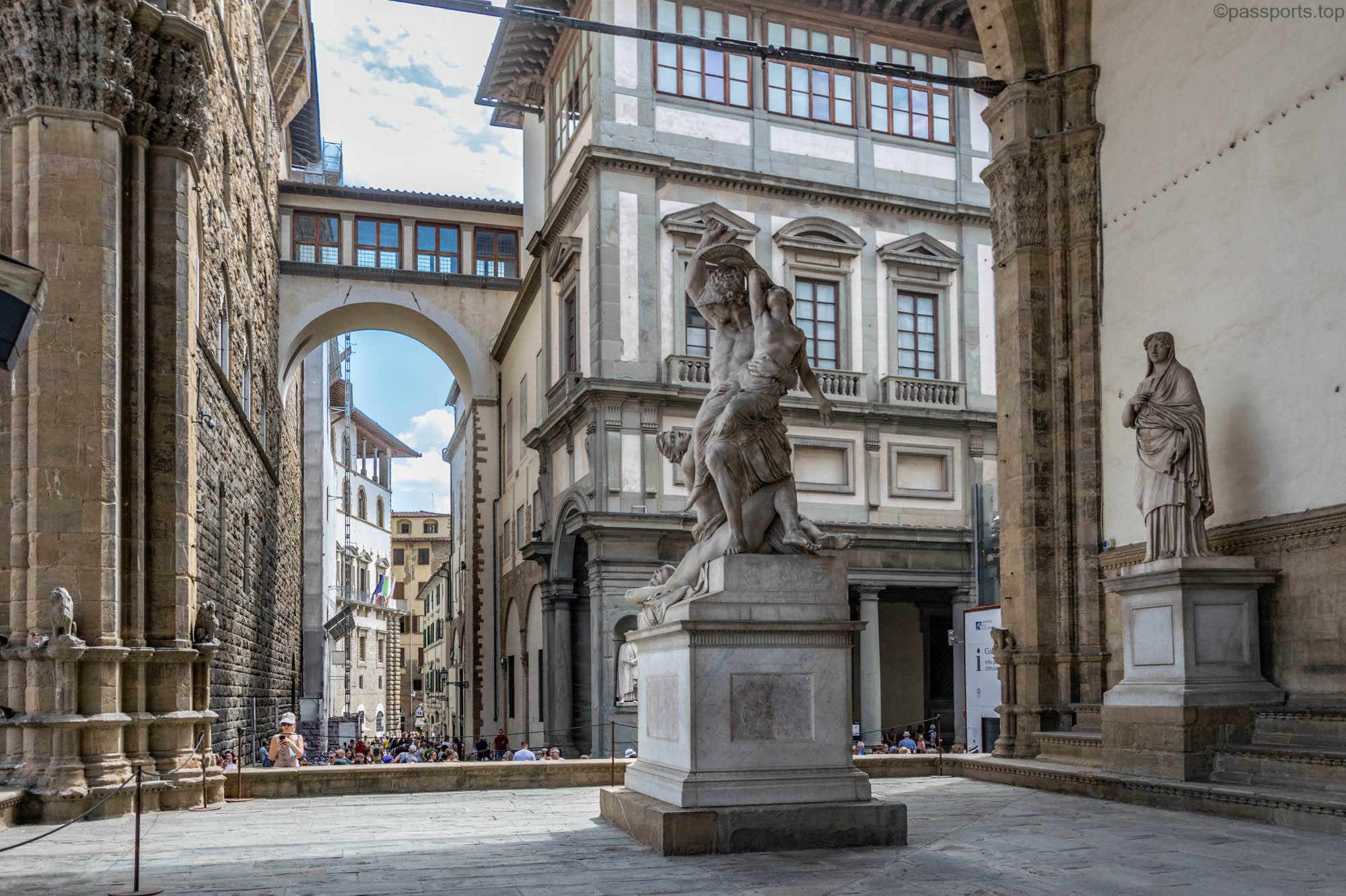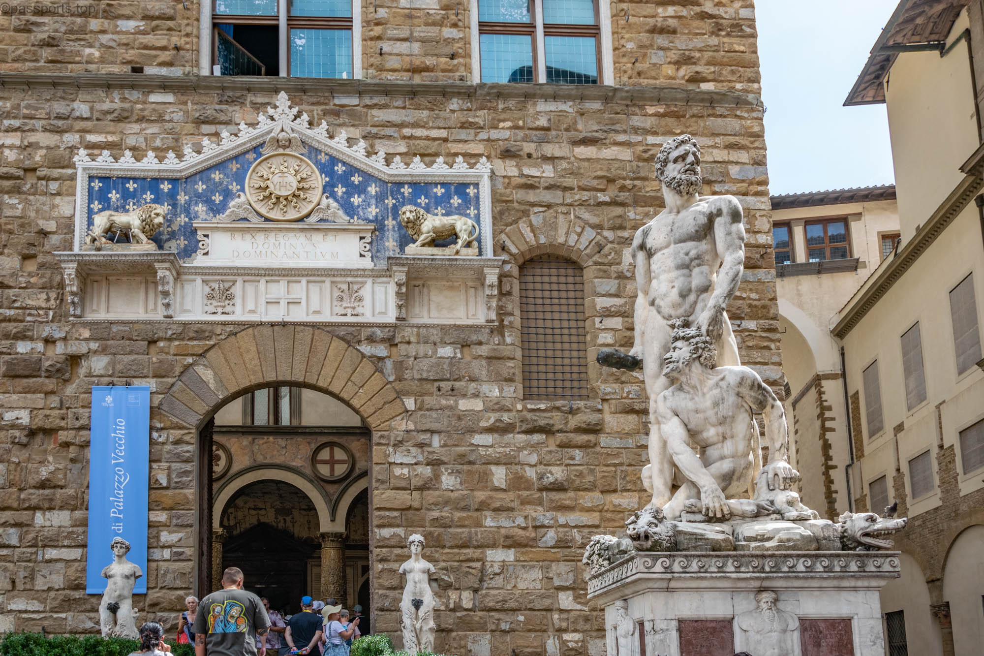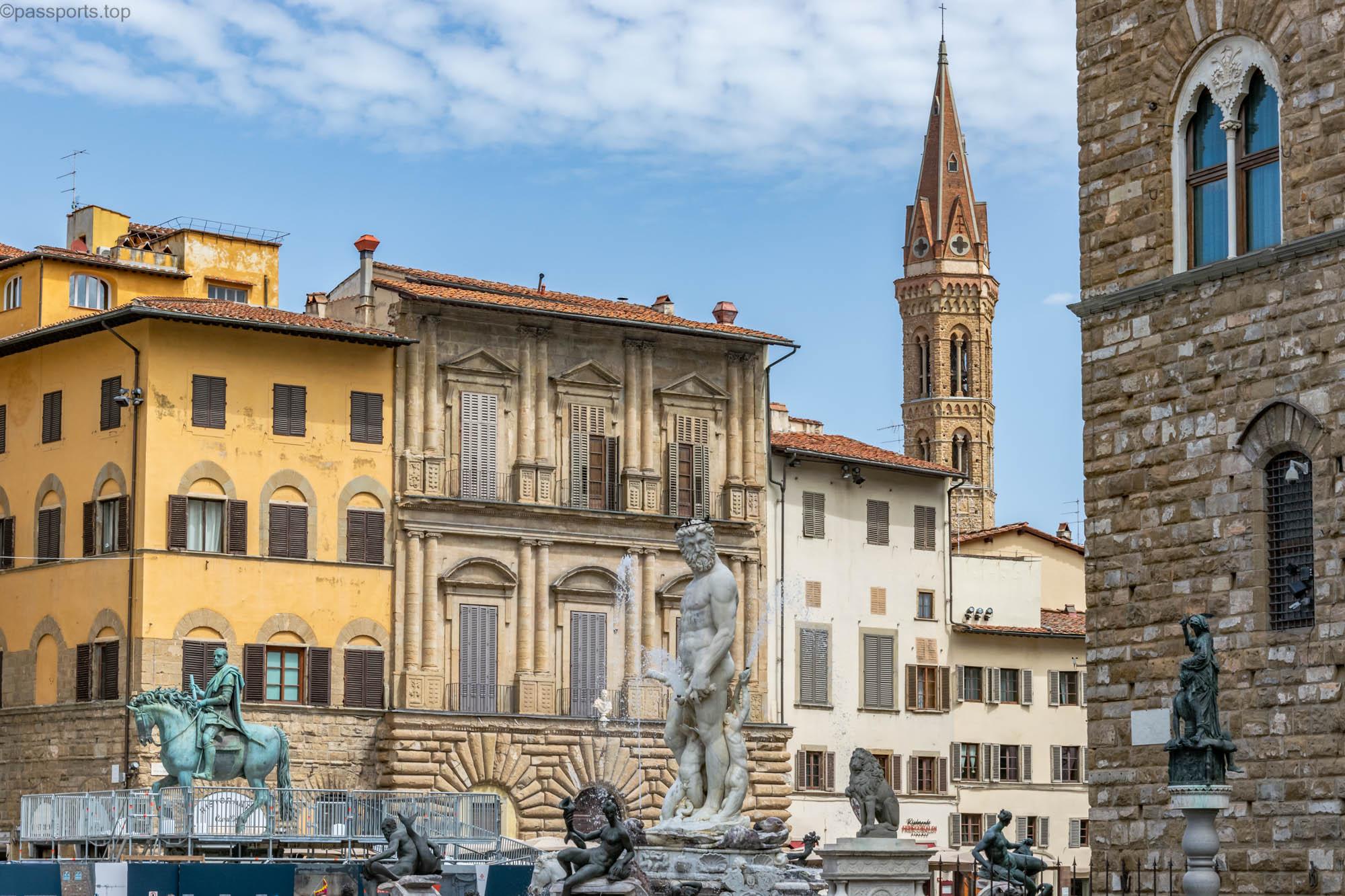The square is full of statues, and among the most important are the 500-year-old Fountain of Neptune, Perseus with the head of Medusa and the replica of the statue of David.