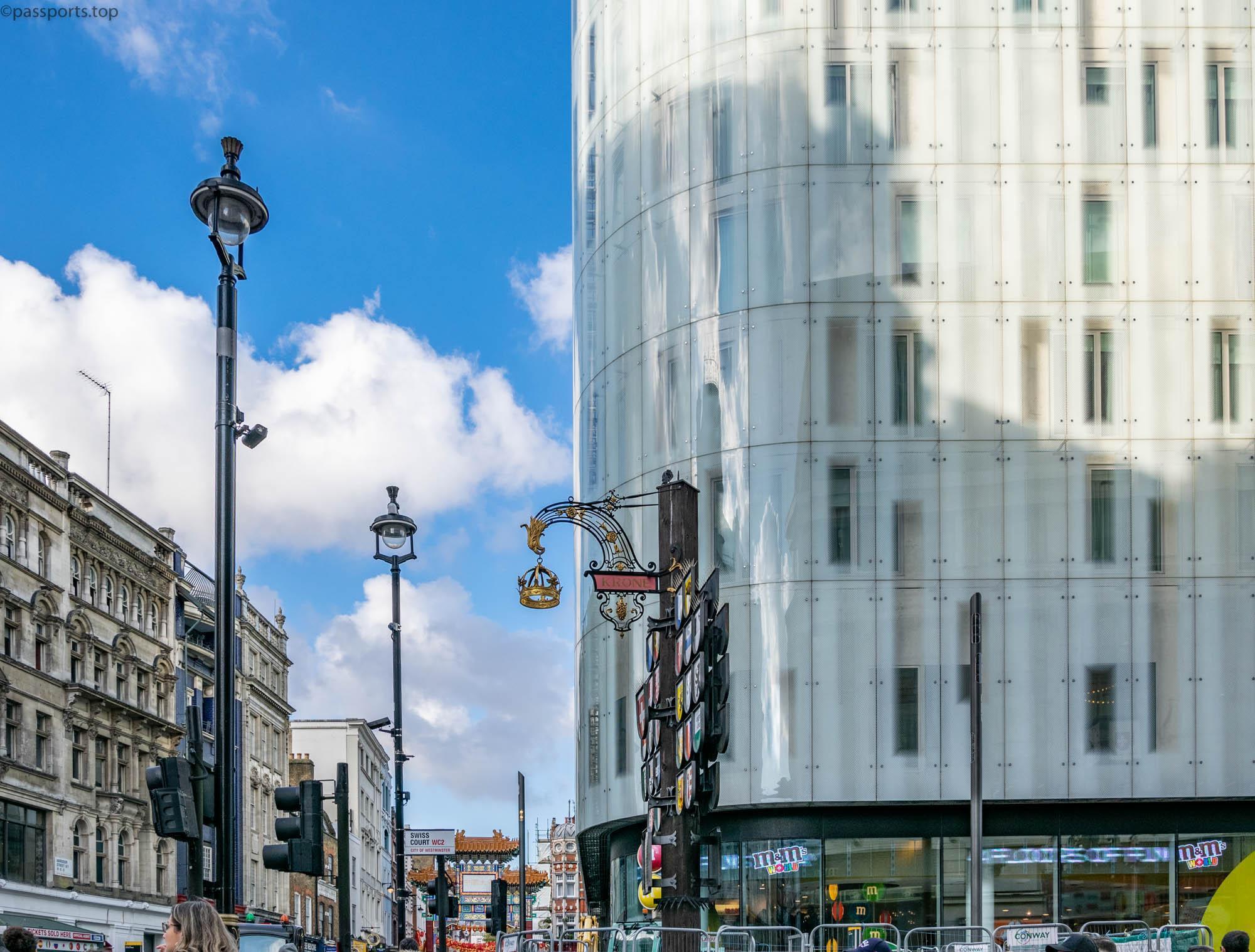 Also in Leicester Square is the Swiss Glockenspiel – a piece of modernist architecture designed to showcase Swiss culture and encourage tourism. On the Leicester Square side is a Carillon – a musical instrument consisting of 27 bells, alongside 11 moving Swiss figures (sculpted by Fritz Fuchs in 1968). The wireless clock is controlled from Derby, while the Glockenspiel plays new music written by the Royal Academy of Music in London and the University of Music and Art in Bern. A few meters away, there is a pole with the 26 flags of the Swiss Cantons.