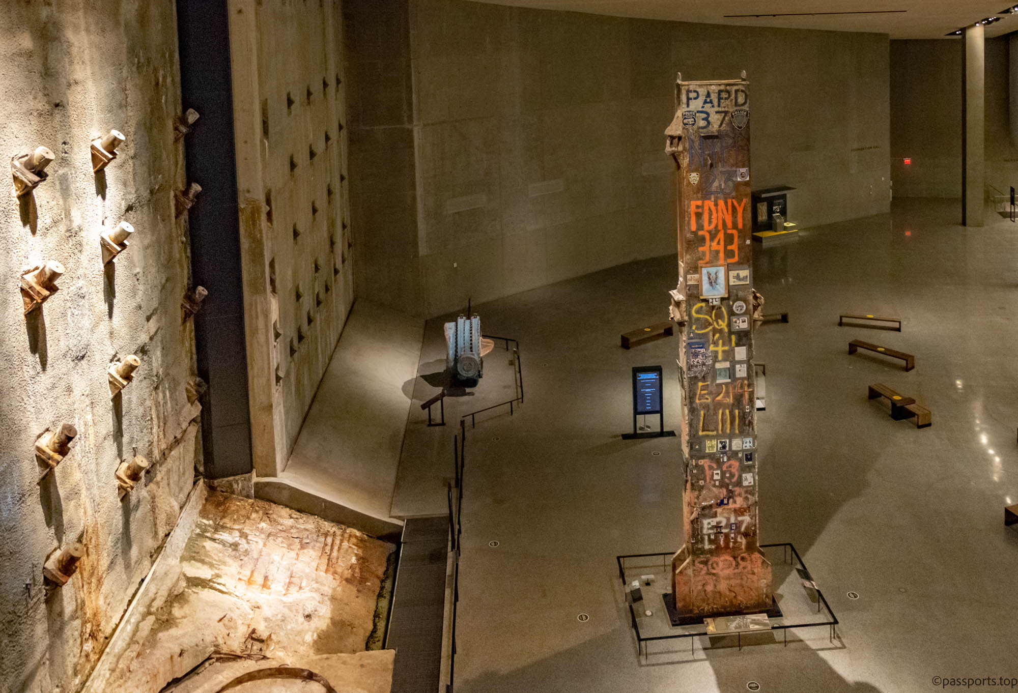 The museum’s largest room is 15,000 square feet and has a 60-foot-high ceiling, and houses an original portion of the World Trade Center‘s retaining wall that withstood the attack.