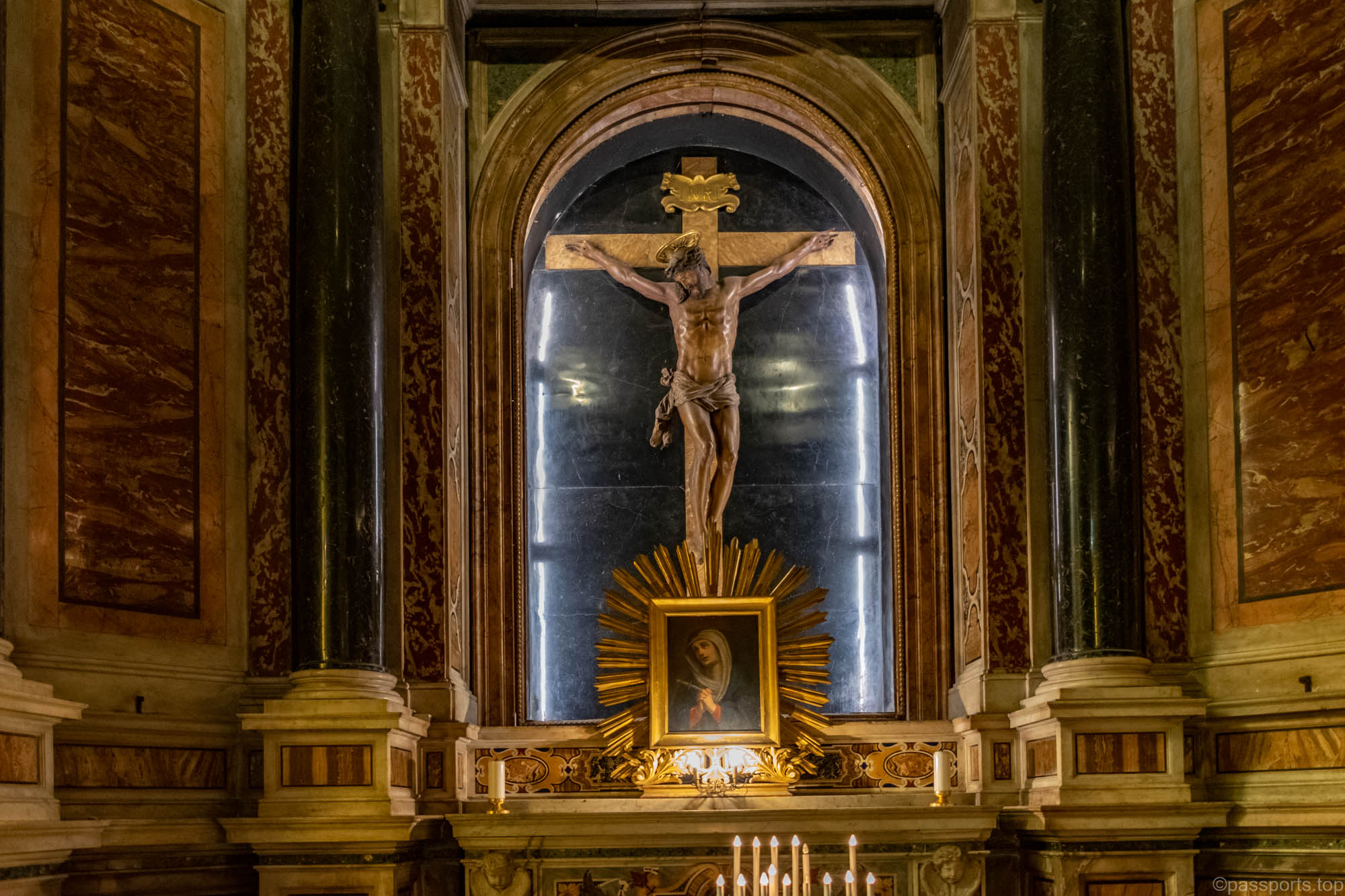 In the center of the main altar is the image of the Madonna dei Miracoli framed by 4 angels. A legend says that a desperate mother invoked the Madonna, painted on a wall along the banks of the Tiber, to save her child who had fallen into the waters of the river. Once saved, it was decided to build a chapel dedicated to the Virgin Mary in which the miraculous painting known as the Madonna dei Miracoli was placed.