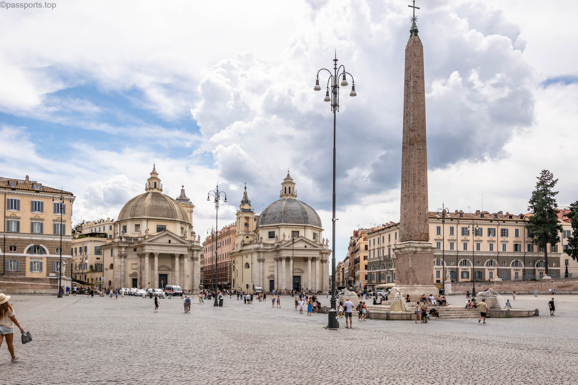 The square is surrounded by historical structures such as the Church of Santa Maria dei Miracoli, Porta del Popolo and Santa Maria in Montesanto.