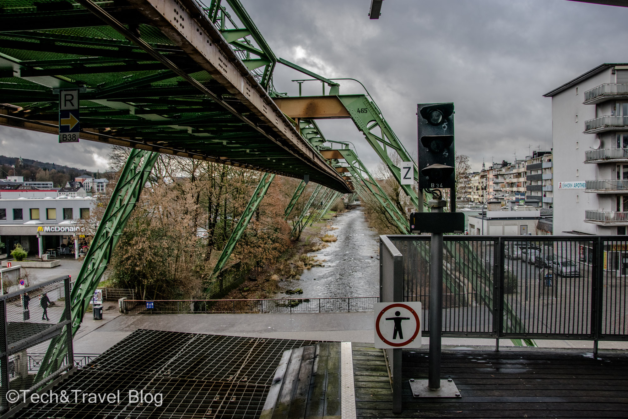 The entire route is 13.3 km long and takes about 30 minutes, during which it stops at 20 stations, the average distance between them being 700 meters. Because the tourist attractions were closed, we purchased a one-day ticket for 2 people (âŹ9.9/2 people) and walked the route from one end to the other. The Schwebebahn passes 12 meters above the Wupper River, past the well-known Bayer plant â multinational chemical and pharmaceutical company, crossing the city from northeast to southwest.