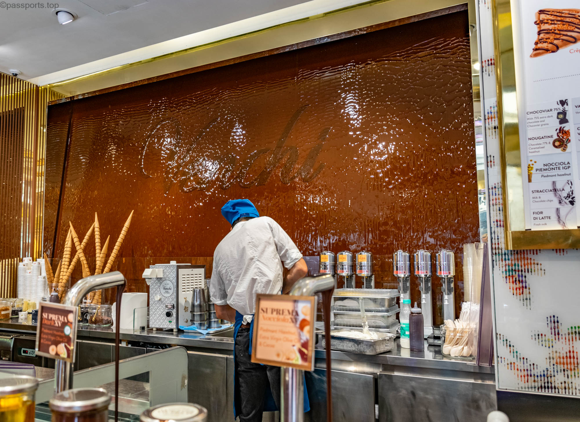 Interiorul este împodobit cu fresce și candelabre și puteți achiziționa creme, parfumuri și chiar produse pentru animalele de companie.