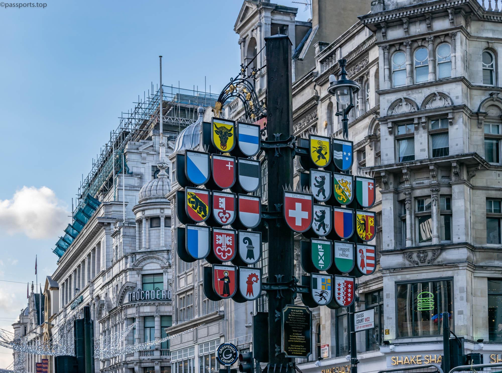 Tot în Leicester Square se află și Swiss Glockenspiel – o piesă de arhitectură modernistă concepută pentru a prezenta cultura elvețiană și pentru a încuraja turismul. Pe partea dinspre Leicester Square se află un Carillon – un instrument muzical format din 27 de clopote, alături de 11 figuri elvețiene în mișcare (sculptate de Fritz Fuchs în 1968). Ceasul wireless este controlat din Derby, în timp ce Glockenspiel cântă muzică nouă scrisă de Academia Regală de Muzică din Londra și Universitatea de Muzică și Artă din Berna. La câțiva metri distanță, se află un stâlp cu cele 26 de steaguri ale Cantoanelor Elvețiene.