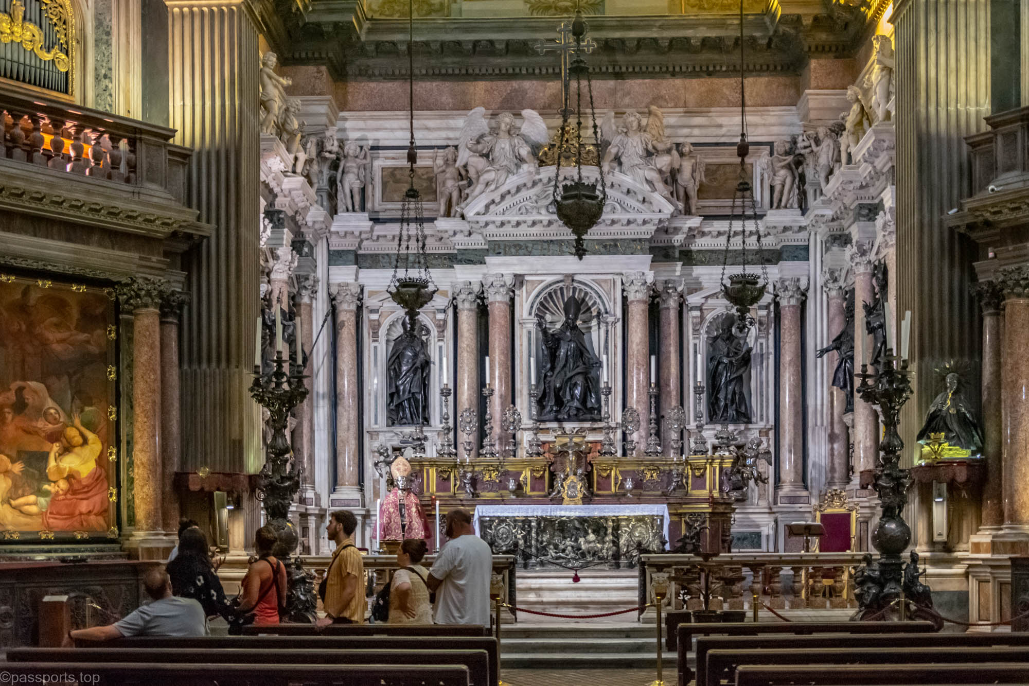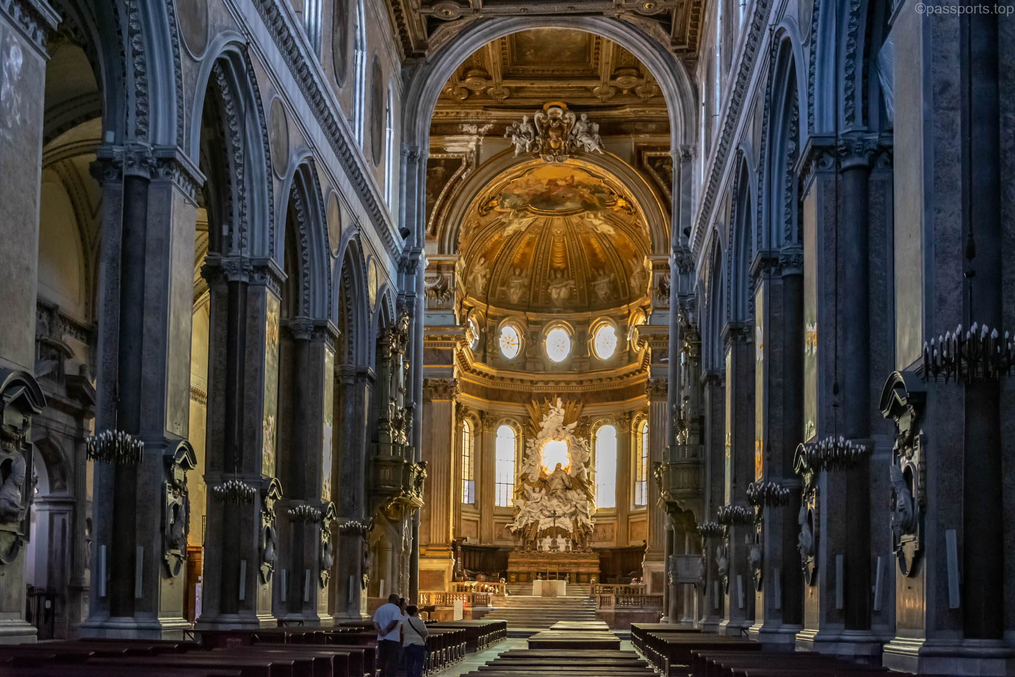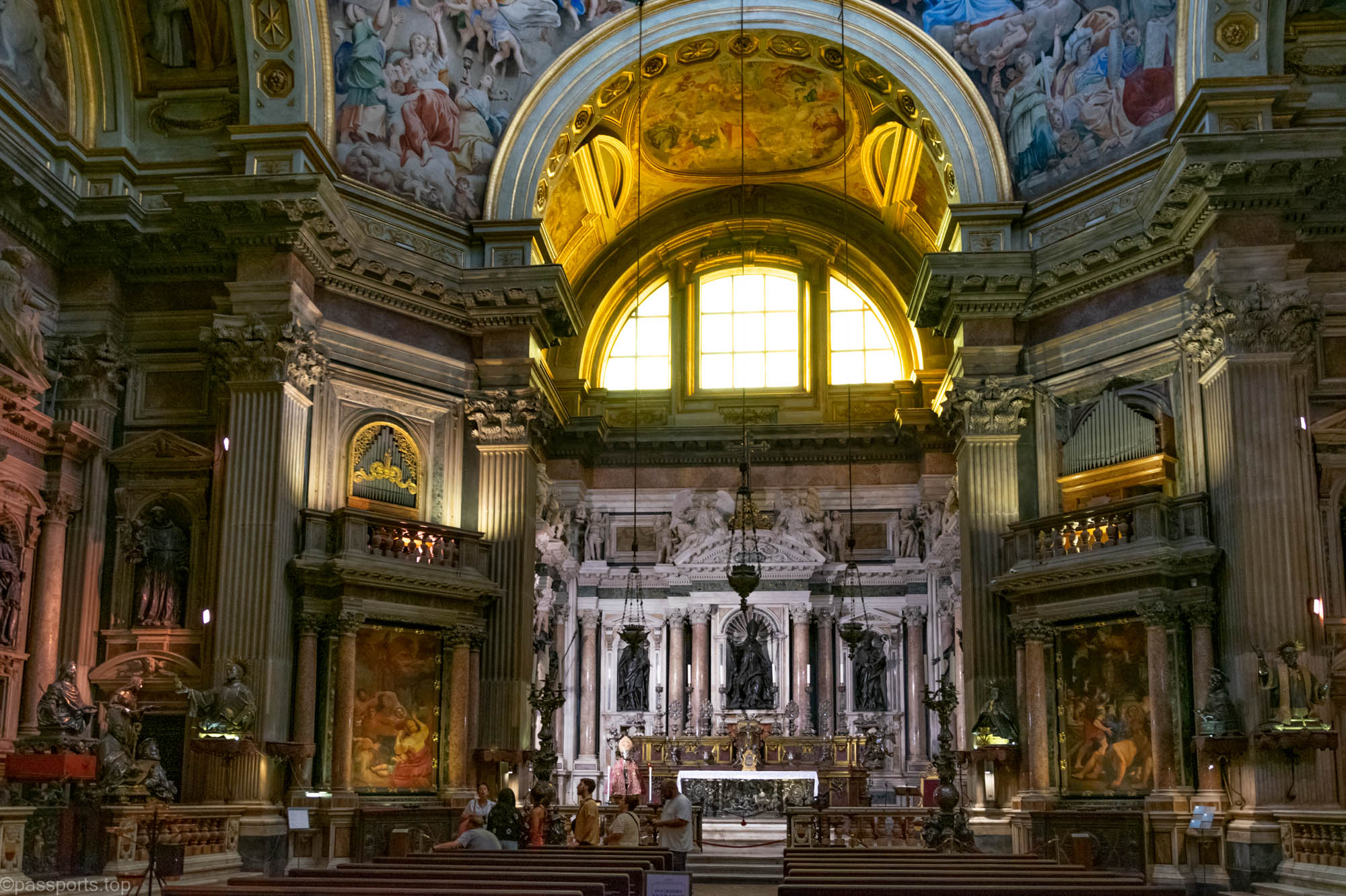 Interiorul este grandios, împodobit cu fresce detaliate, altare mărețe, sculpturi și pânze ale unor artiști italieni celebri.