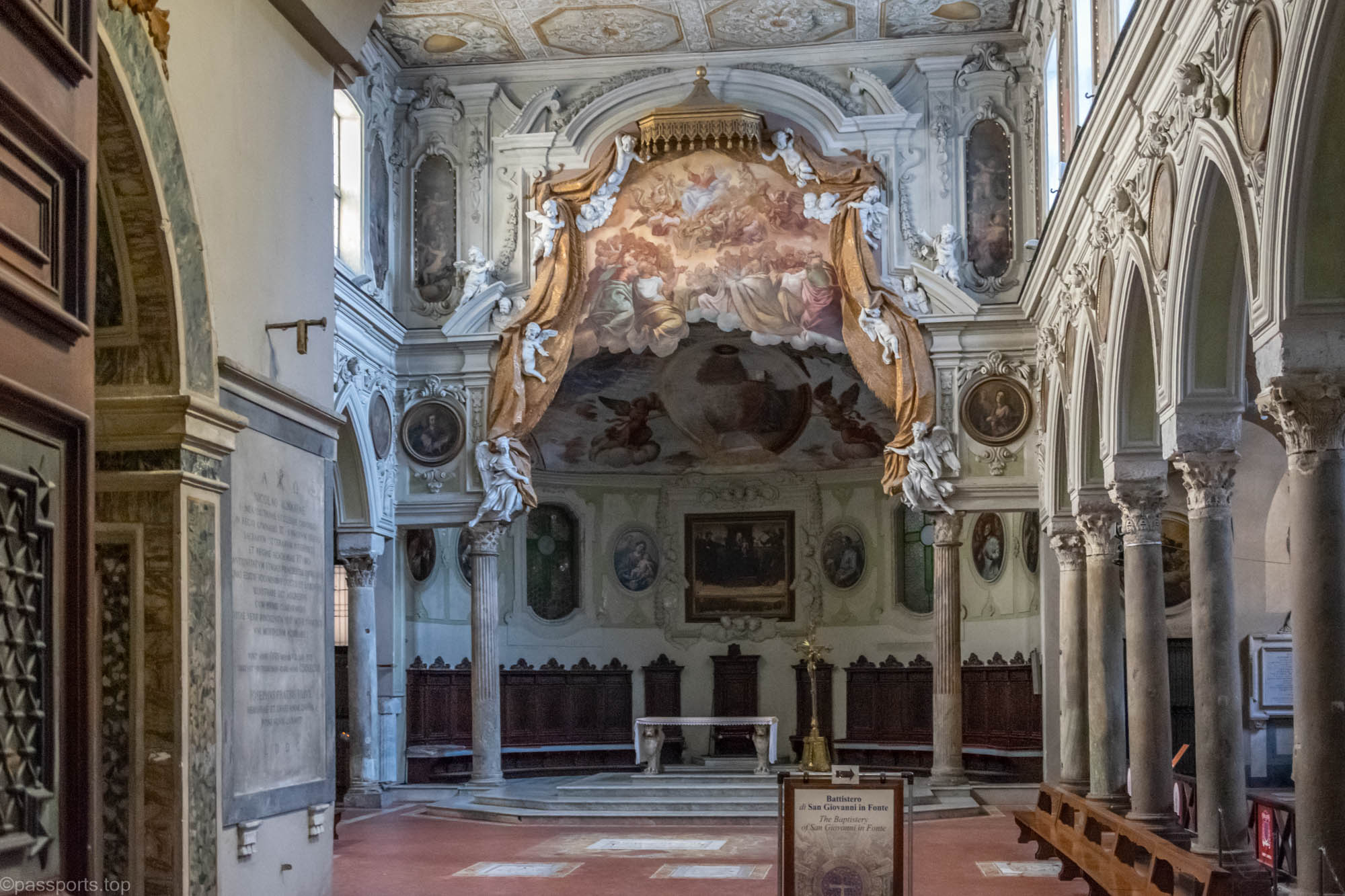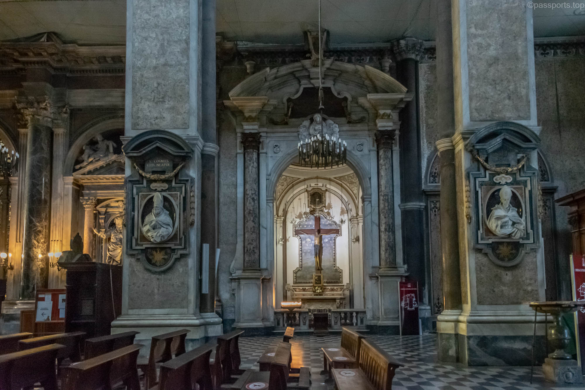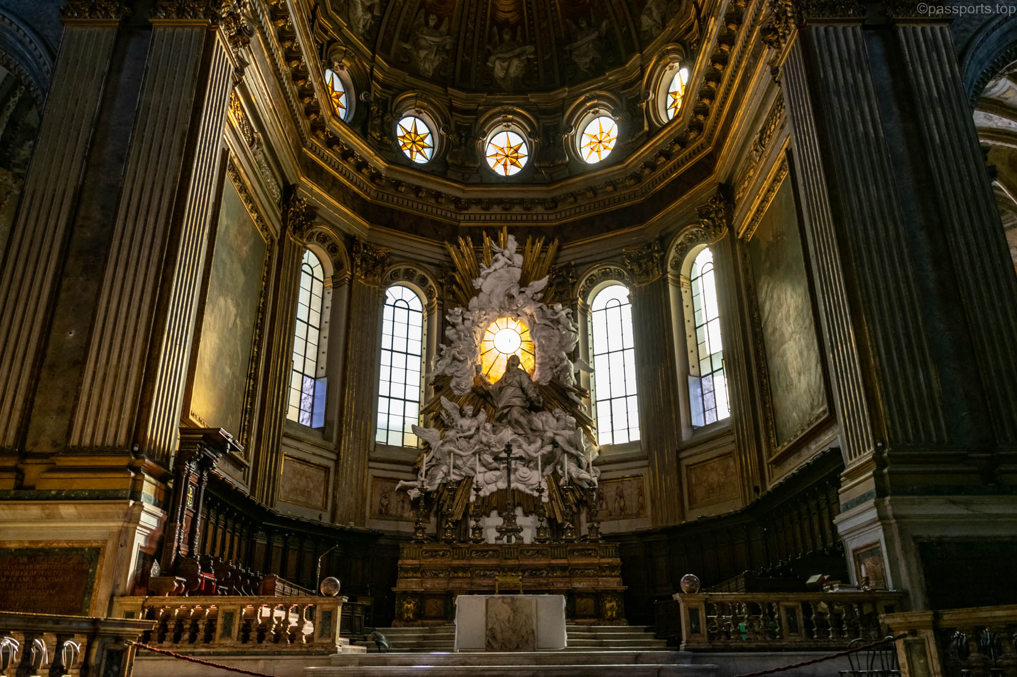 Interiorul este grandios, împodobit cu fresce detaliate, altare mărețe, sculpturi și pânze ale unor artiști italieni celebri.
