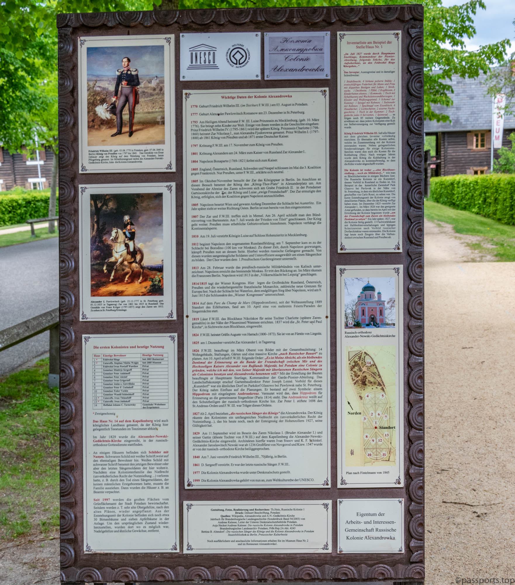 Colonia Rusească (Russische Kolonie) a fost fondată între 1826 și 1927, la cererea lui Friedrich Wilhelm III în memoria prietenului său, țarul Alexandru I. Casele din lemn construite în stil rusesc fac astăzi parte din patrimoniul cultural mondial și adăpostesc un muzeu (Muzeul Alexandrowka; preț bilet 3,5€/persoană), un restaurant cu specific rusesc și o capelă (Capela Alexander Nevsky).