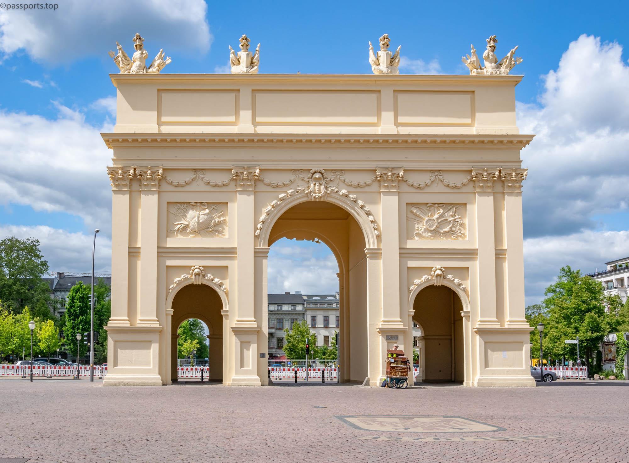 Poarta Brandenburg din Potsdam este cu 18 ani mai veche decât faimoasa Poartă Brandenburg din Berlin. Motivul pentru care au fost denumite identic este că drumurile care porneau de la ambele porți obișnuiau să conducă spre orașul Brandenburg. Poarta a fost ridicată în 1770 la ordinele lui Frederick II (Frederick cel Mare), după încheierea Războiului de Șapte Ani, fiind unul dintre câștigătorii războiului.