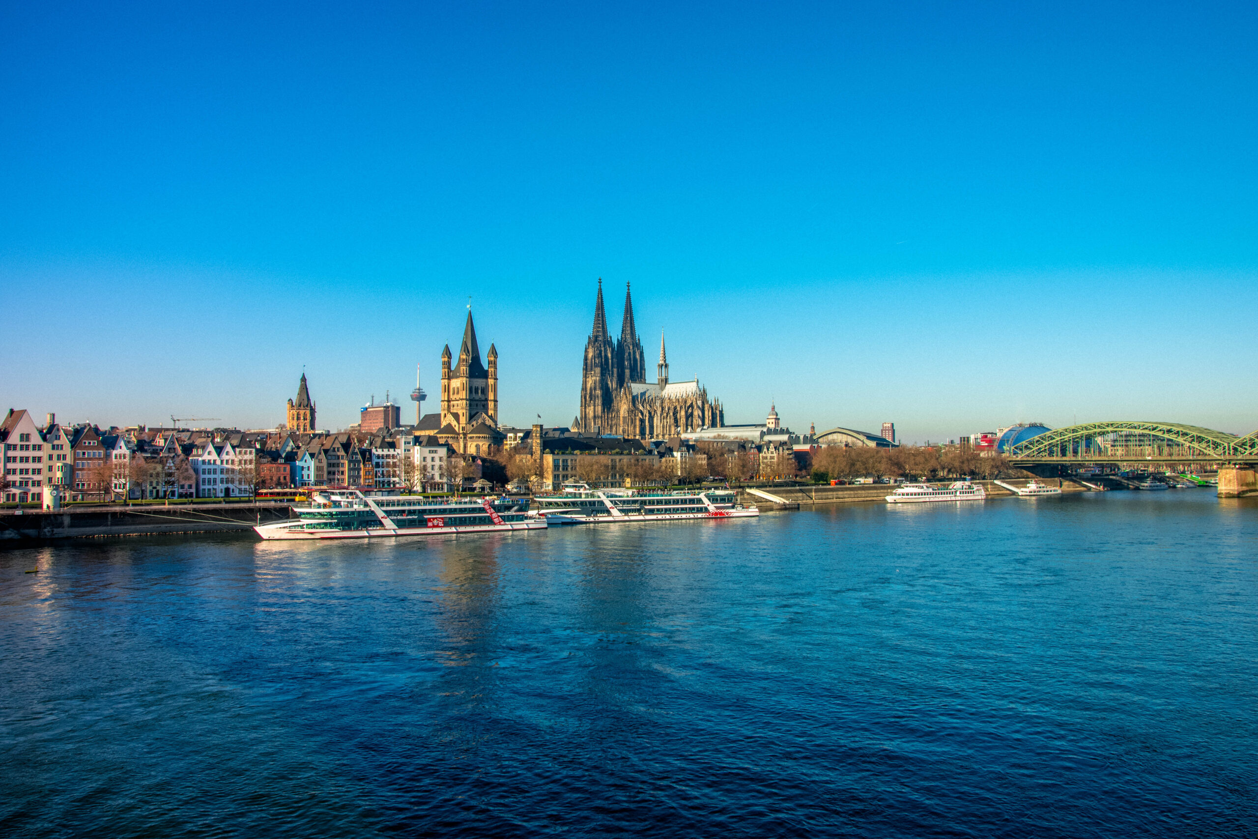 ⦁ arhitectura sa metalică și cele patru turnuri masive sunt iluminate spectaculos în timpul nopții, creând o priveliște impresionantă și romantică a podului traversând râul Rin.