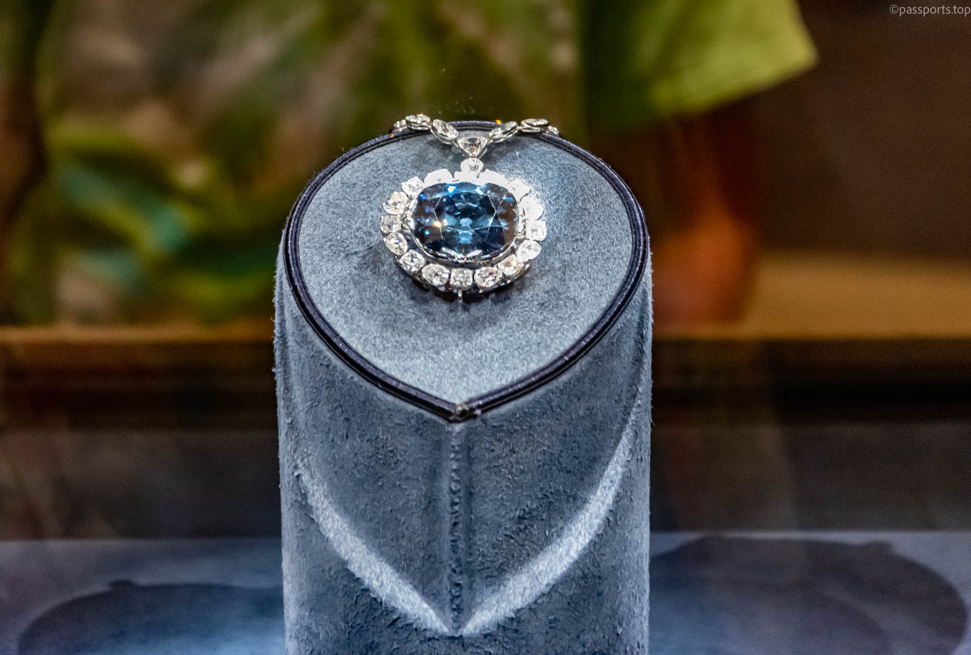 Printre cele mai impresionante exponate se numără The Hope Diamond (una dintre cele mai faimoase bijuterii din lume care datează de aproape patru secole. Diamantul cântărește 45,52 carate (aprox. 9 grame) și provine din India. Culoarea albastră unică a diamantului este principalul motiv pentru care majoritatea oamenilor cred că este de neprețuit. Cu toate acestea, valoarea este estimată la aproximativ un sfert de miliard de dolari).